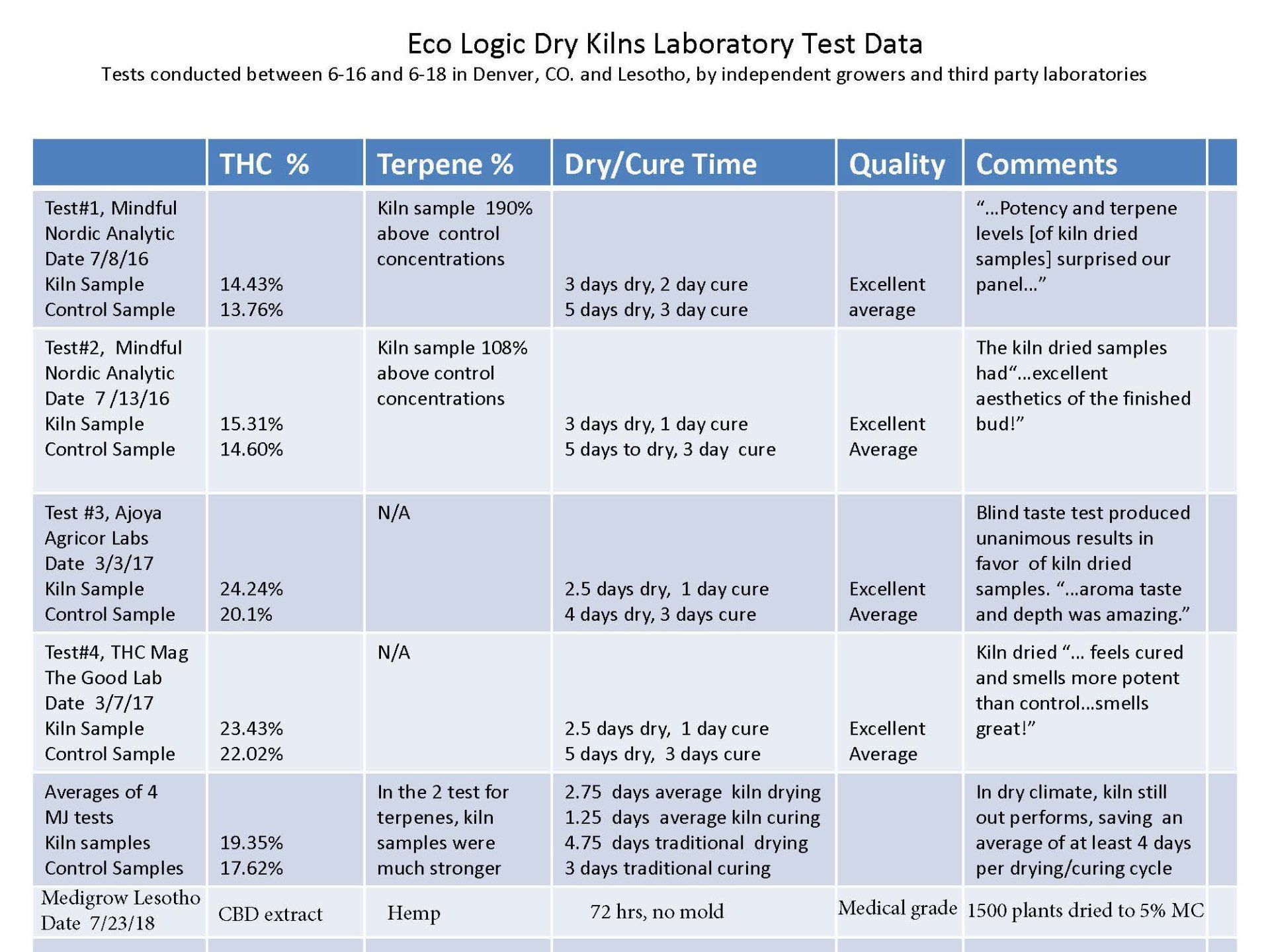 CBD and THC test results are shown below. Eco Logic Dry Kilns achieved in 28 hours what traditional methods require a week or more to attain.